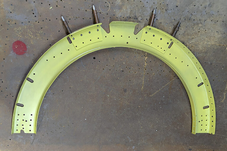 Esta nervura fica entre os Arcos de Fuselagem #16 e #17 na parte traseira inferior do SBD e sustenta a face inferior do suporte do trem de cauda do lado direito. Para referência, esta é a face inferior, com sua borda inferior voltada para a parte traseira da aeronave — as filas paralelas de furos são onde o suporte do trem de cauda é fixado. (imagem via Pioneer Aero Ltd.)