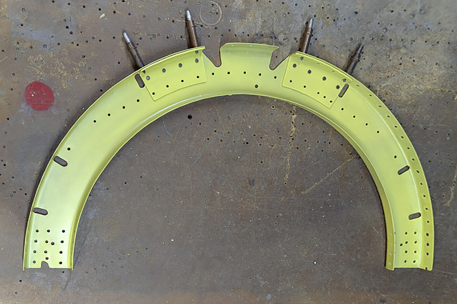Estes dois reforços compõem parte da estrutura que sustenta os suportes de montagem do gancho de retenção na parte traseira inferior da fuselagem. Eles conectam as longarinas da quilha ao suporte do gancho de retenção entre os Arcos de Fuselagem #13 e #14. São componentes originais do B-22 e são vistos aqui no gabinete de pintura aguardando uma camada de primer. (imagem via Pioneer Aero Ltd.)
