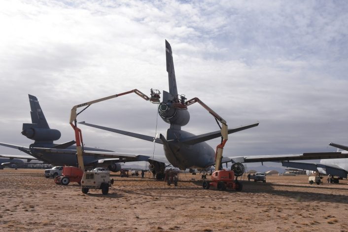 Técnicos em plataformas elevatórias aplicam um revestimento preservador removível, à base de água e não tóxico, em um KC-10 aerial tanker no 309th Aerospace Maintenance and Regeneration Group em Davis-Monthan Air Force Base, Tucson, Ariz., 12 de fevereiro de 2025. (Crédito da imagem: foto do DoD por David Vergun)