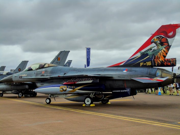 F-16 da RNLAF com decalques celebrando o 50.º aniversário do F-16 em julho de 2024 no Royal International Air Tattoo. (Crédito da imagem: James Gray)