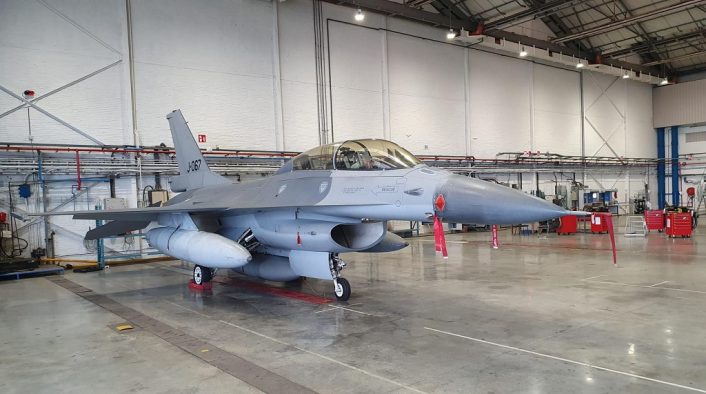 O primeiro F-16 BM entregue ao EFTC em julho de 2024, fotografado numa hangar antes de partir para a Romênia. (Crédito da imagem: Dutch Ministerie van Defensie)