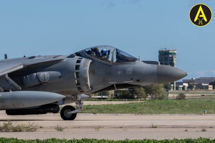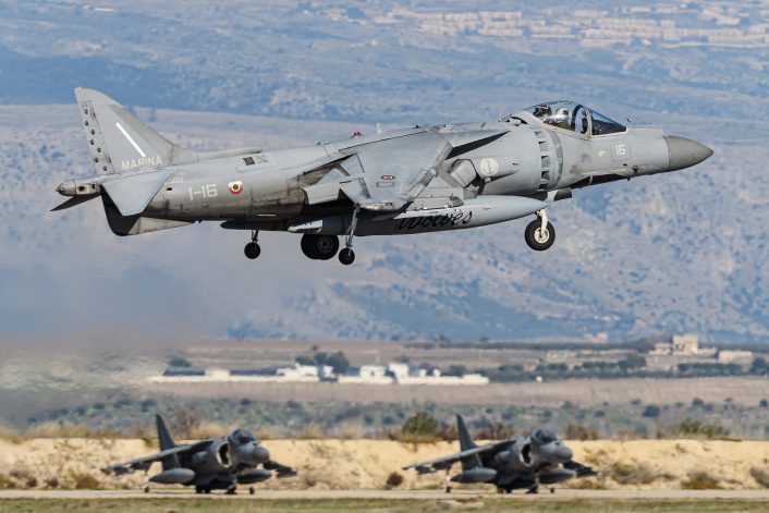 Um AV-8B+ Harrier II da Marinha Italiana realiza uma decolagem curta durante o exercício. (Crédito da imagem: Alessandro Fucito/The Aviationist)