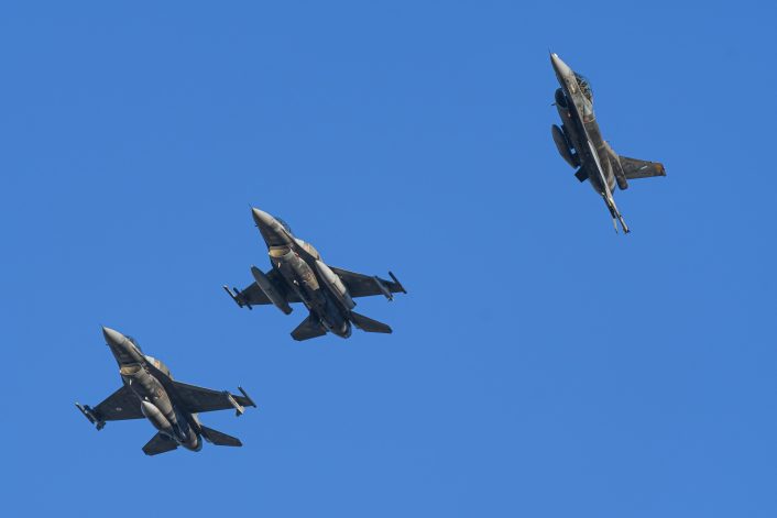 Três F-16 da Força Aérea Helênica retornam de uma missão do Falcon Strike 2025. (Crédito da imagem: Alessandro Fucito/The Aviationist)