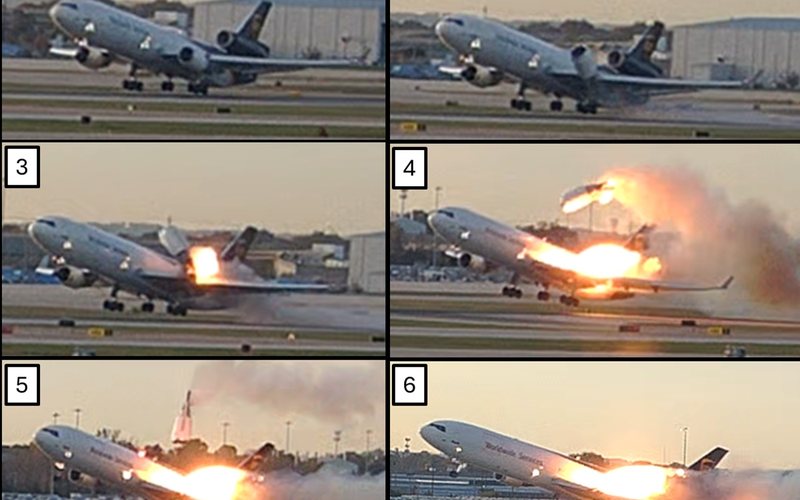Segundo o documento, o MD-11F de matrícula N259UP iniciou a decolagem pela pista 17R às 17h14 (horário local). Imagens de câmeras de vigilância do aeroporto, incluídas no relatório, mostram a separação do motor nº 1 e do pilone do lado esquerdo imediatamente após a rotação.